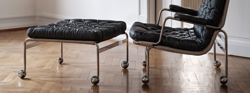Nombrada por el año de su lanzamiento, la Karin 73 fue la primera evolución del sillón Karin original diseñado por Bruno Mathsson. Este elegante reposapiés es una incorporación esencial a la colección, ya que ofrece un mayor confort con cojines acolchados que descansan sobre una estructura cromada con una red de apoyo.