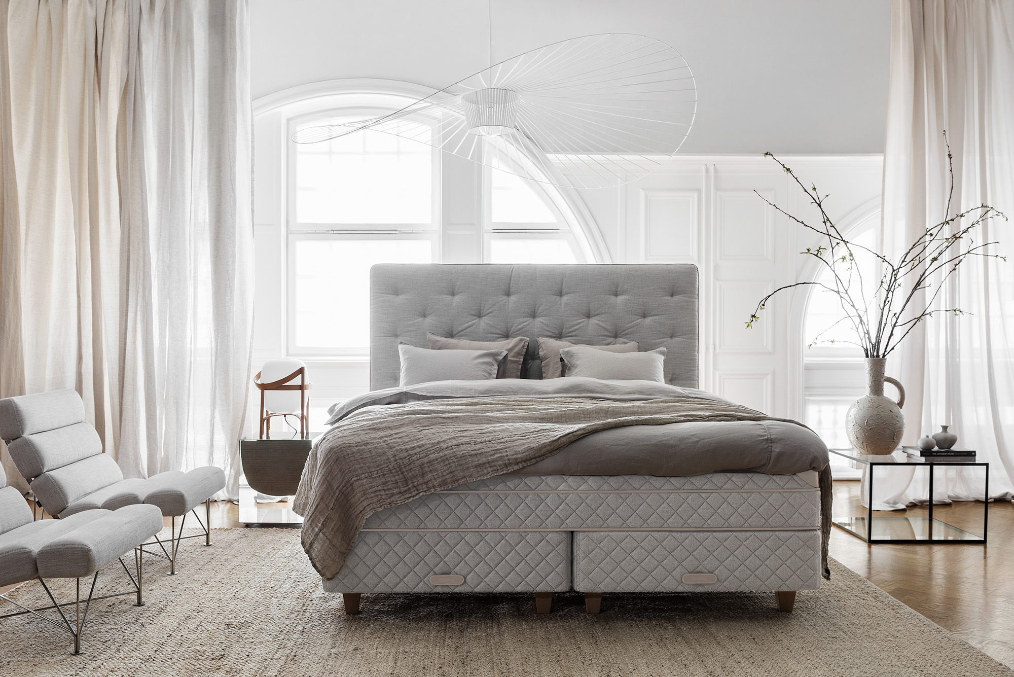 DUX Royal es una serie de accesorios de cama complementarios, como faldones de cama y cojines decorativos. El diseño se desarrolló en colaboración con el emblemático Hotel d'Angleterre de Copenhague. Un cabecero con un acolchado cómodo. El diseño sencillo se basa en el tradicional capitoné pronunciado y también está disponible con o sin botones.