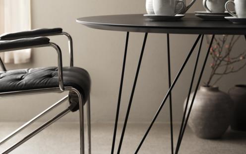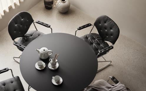 Mesa de café redonda que fomenta la conversación y el contacto visual con todos los invitados. También disponible como mesa de comedor o con dos secciones extensibles.