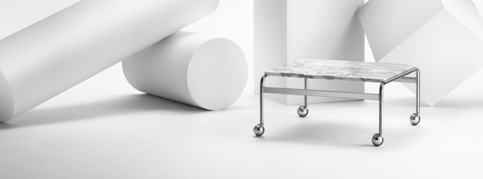 Bruno Mathsson diseñó esta mesa para acompañar a su clásica gama de sillones Karin. La elegante estética de la colección Karin destaca claramente, con una estructura cromada cubierta con mármol, piedra caliza o nogal exclusivos.