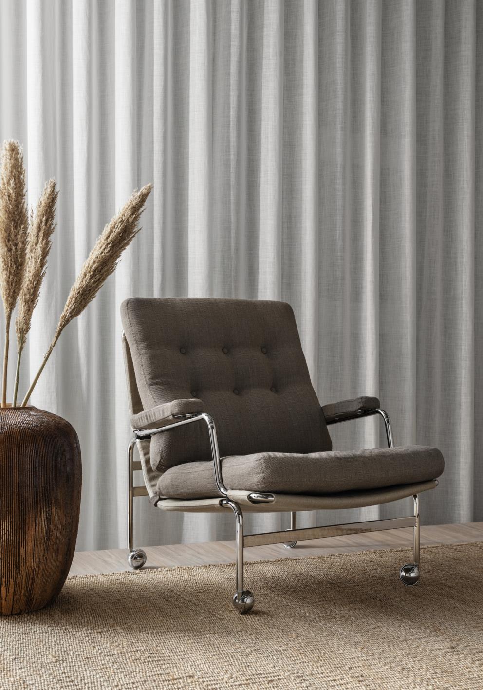 Karin es una butaca clásica y elegante, presenta un diseño sencillo con una estructura de cromo elegante y un cojín con unas costuras profundas.