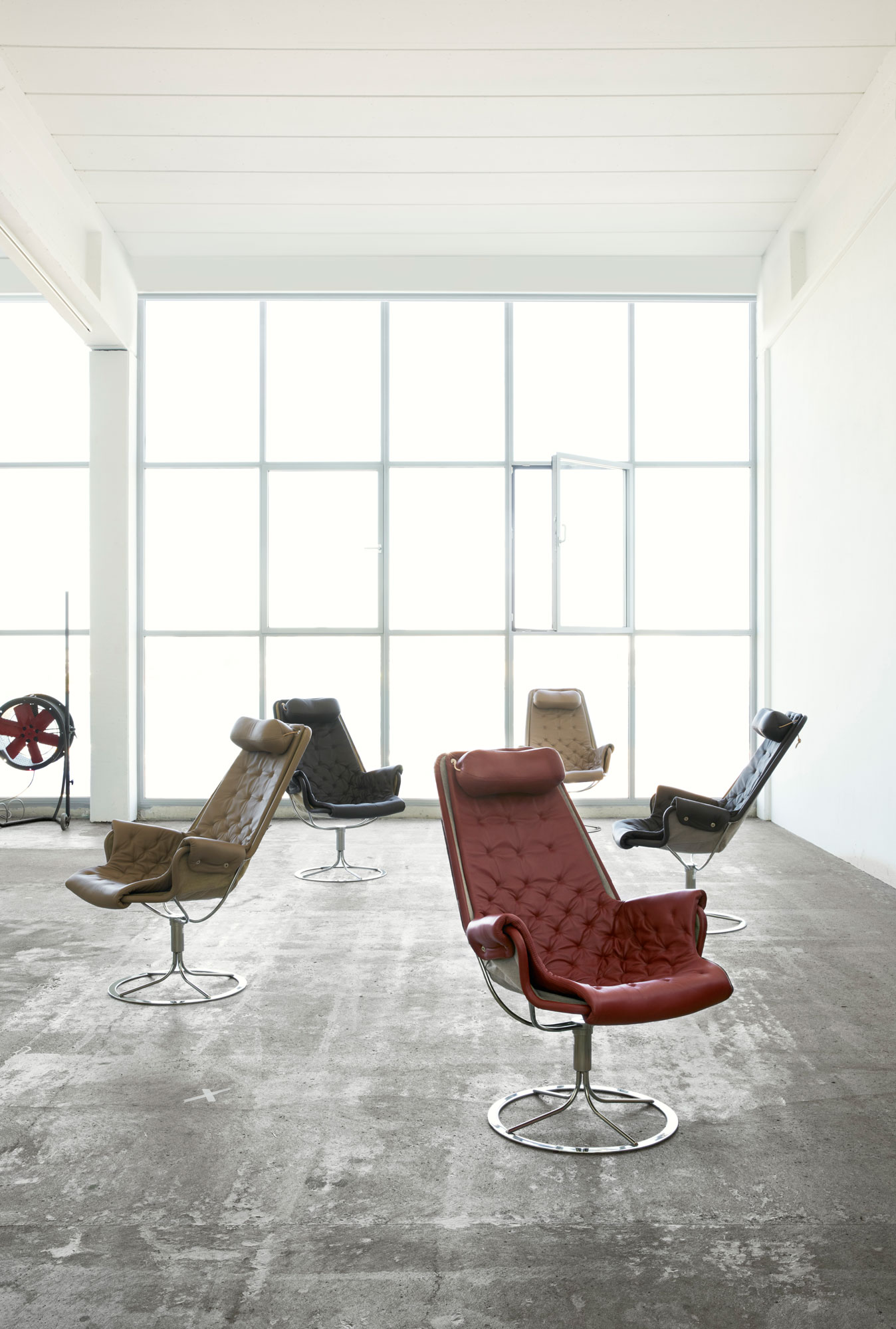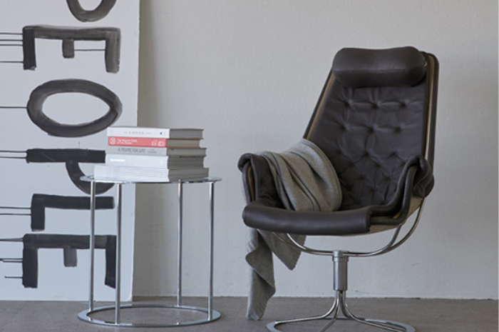 La icónica butaca Jetson cuenta con un asiento en forma de cuenco y un respaldo alto y ergonómico con cojín para la cabeza.