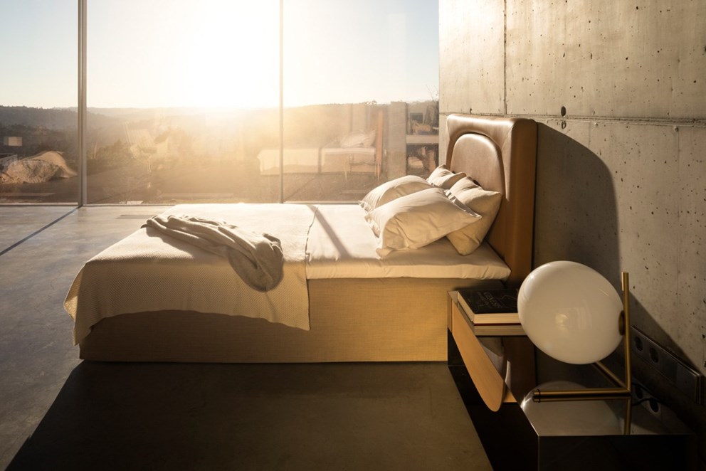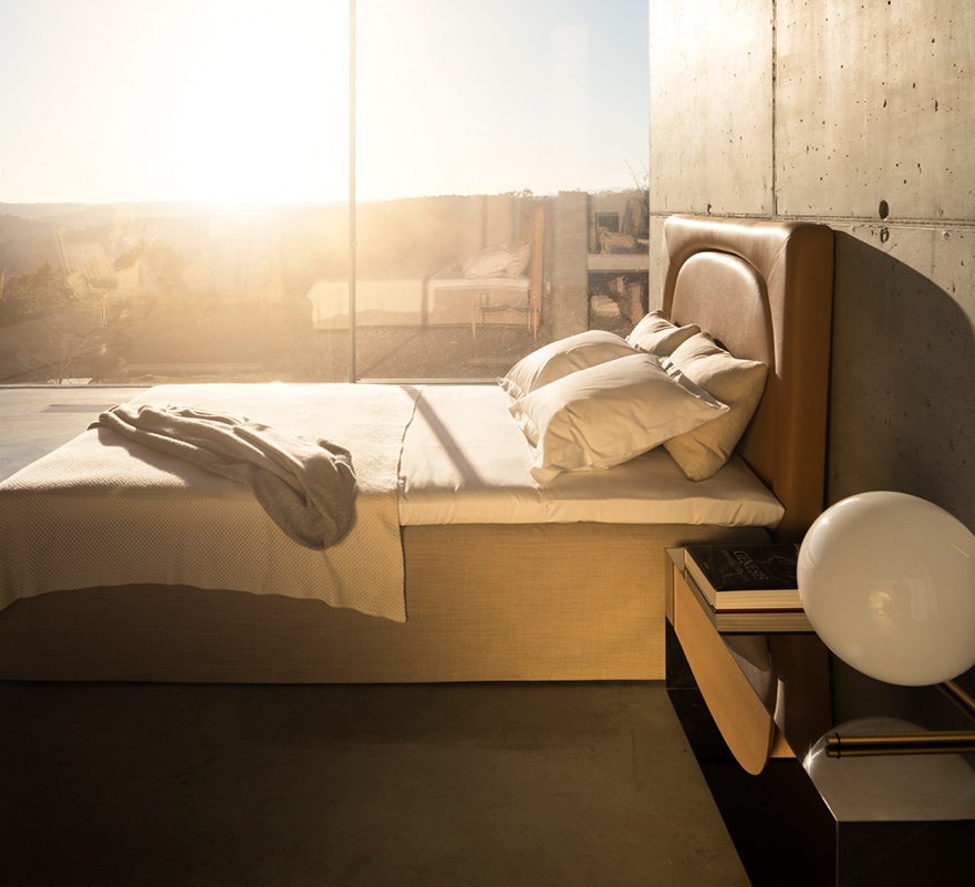 Eden es un suave cabecero tapizado para la cama DUX con un diseño sencillo pero elaborado en forma de arco.