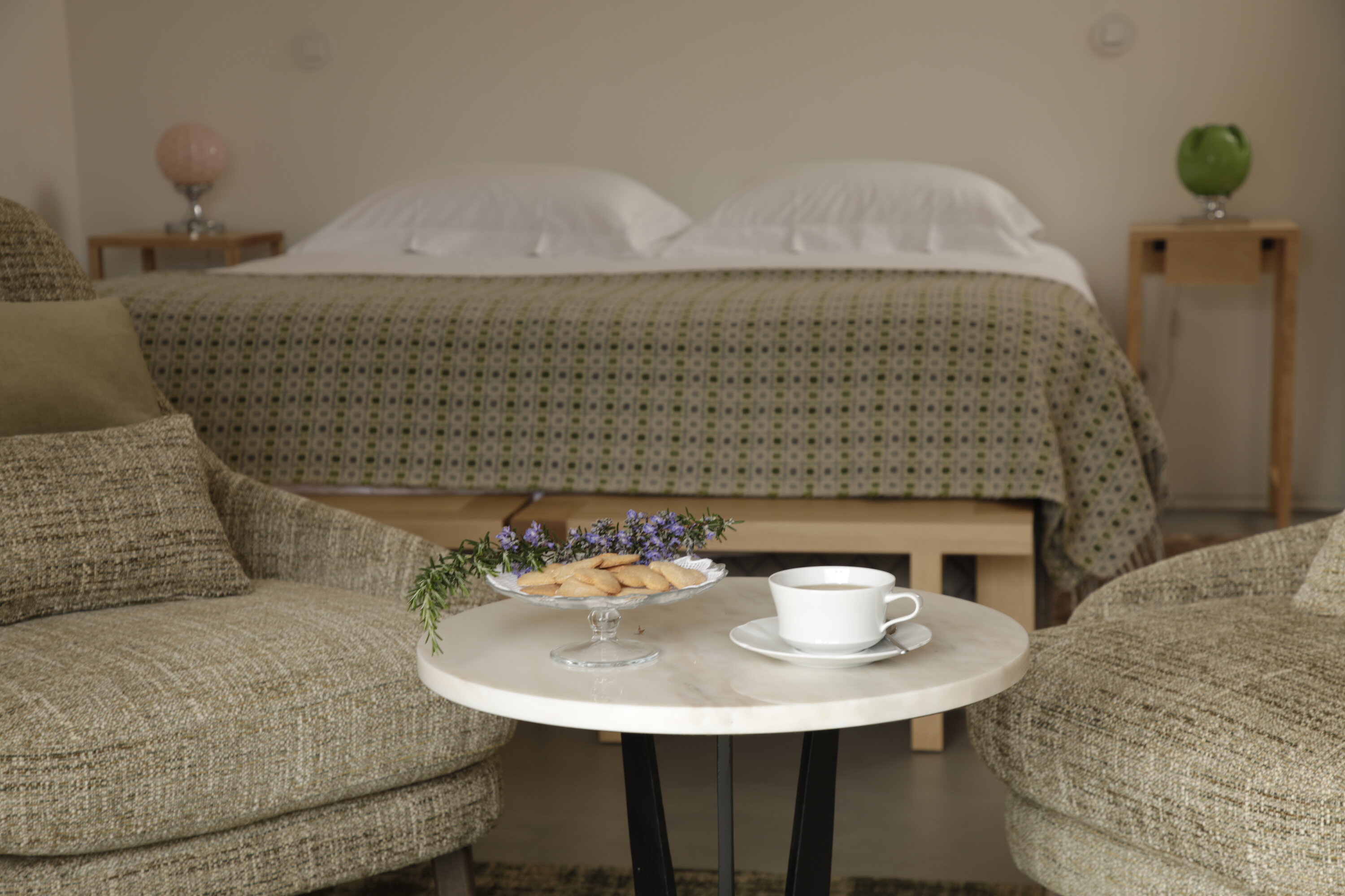 - El alojamiento, un aldea formada por un grupo de pequeñas casas repartidas sobre las terrazas de la colina de Brufe, ofrece un lugar/tiempo para relajarse, reflexionar y encontrarse con la naturaleza.